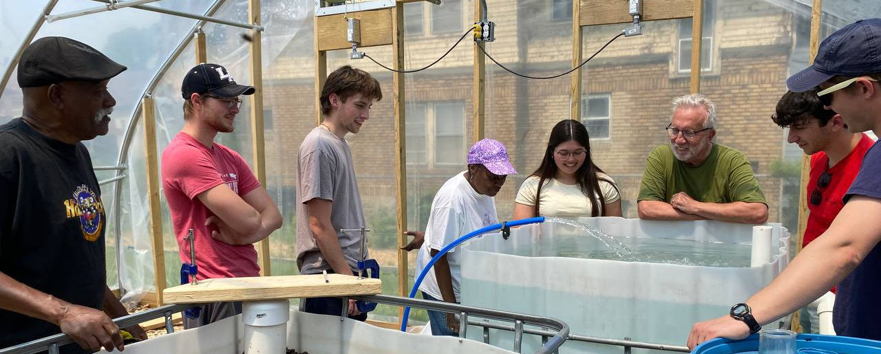 EWM members designed, constructed, and implemented an aquaponics system for a Cleveland community garden. Designed to be entirely off the grid and self-sustaining, this system utilizes the ecosystem interaction between aquatic life and the filtration of plant life to maintain the garden’s growth. Powered by an array of solar panels, this system is entirely green.